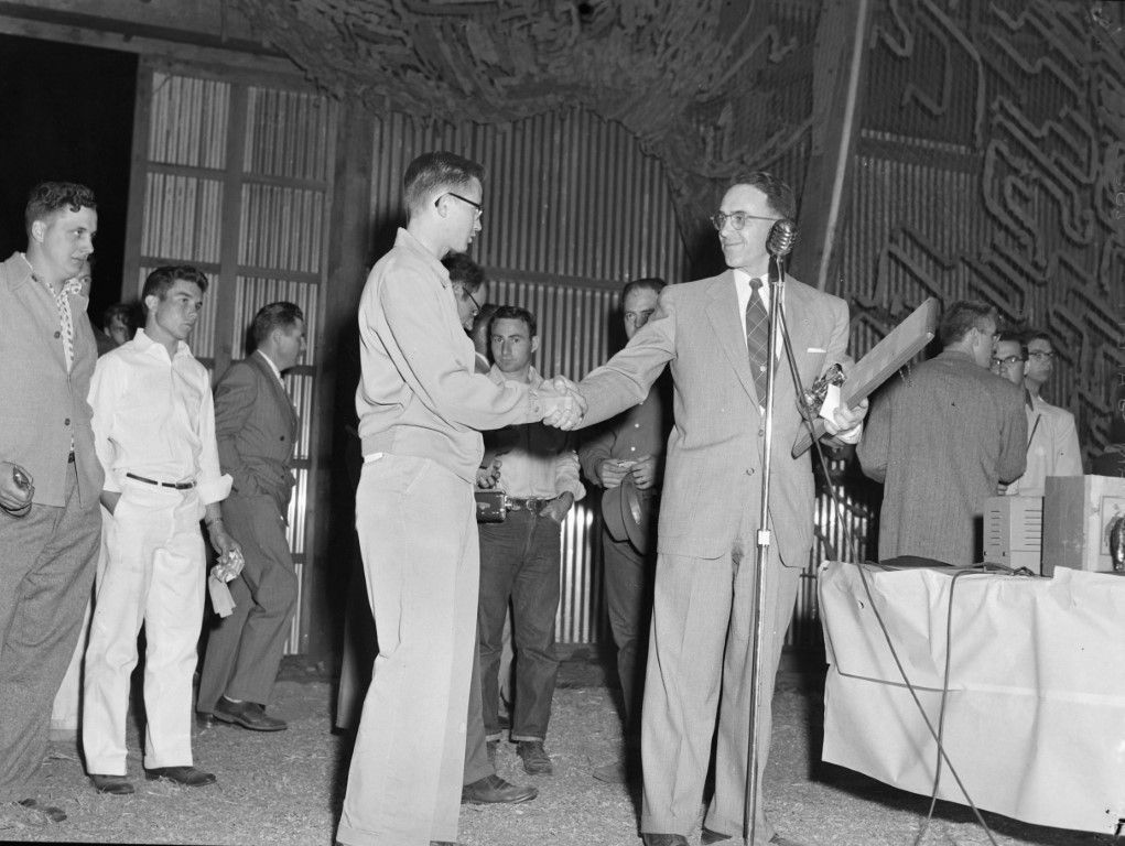 A young man is shaking hands with a man in a suit who is presenting him with an award. Several men are watching in the background.
