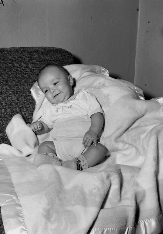 A smiling baby sitting on a blanket on a couch in Moscow, Idaho.