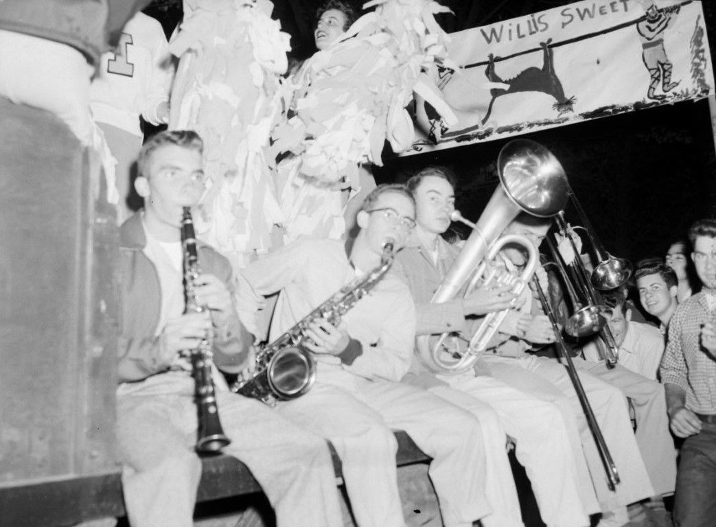 Guys with band instruments sitting on a parade float. Cheerleaders, onlookers, and a "Willis Sweet" banner are seen in the background.