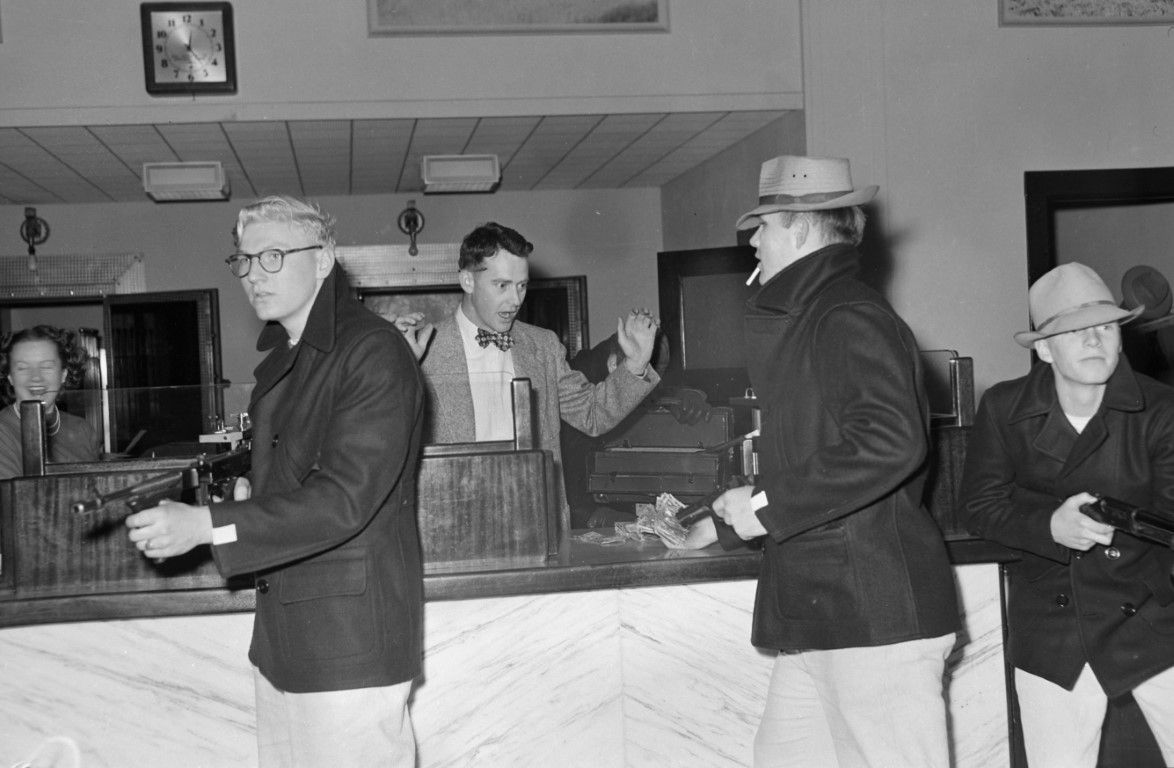 Three young men with guns are staging a holdup of a bank teller during a mock robbery.