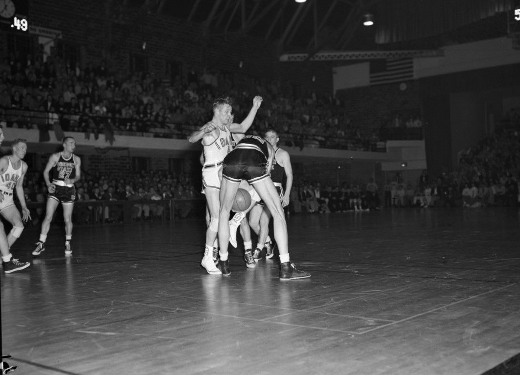 University of Idaho and Oregon State basketball players in action in front of a large crowd of spectators.