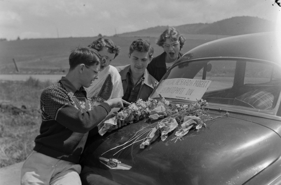 A student research team is in the field examining a variety of specimens on the trunk of a car.