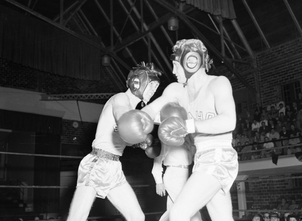 A University of Idaho boxer in the ring with another fighter in front of a crowd of spectators. Memorial Gymnasium U of I U of I boxer vs San Jose State boxer