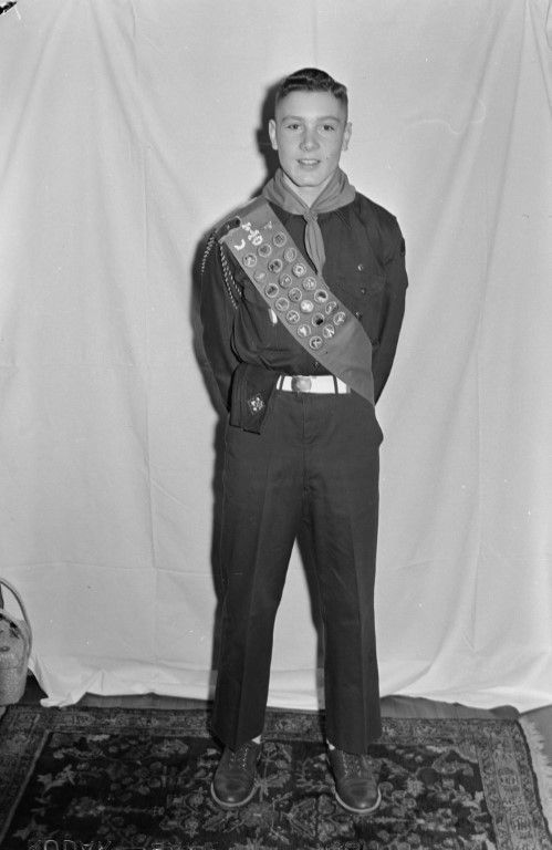A young man in Boy Scout uniform and sash with badges poses for a photo