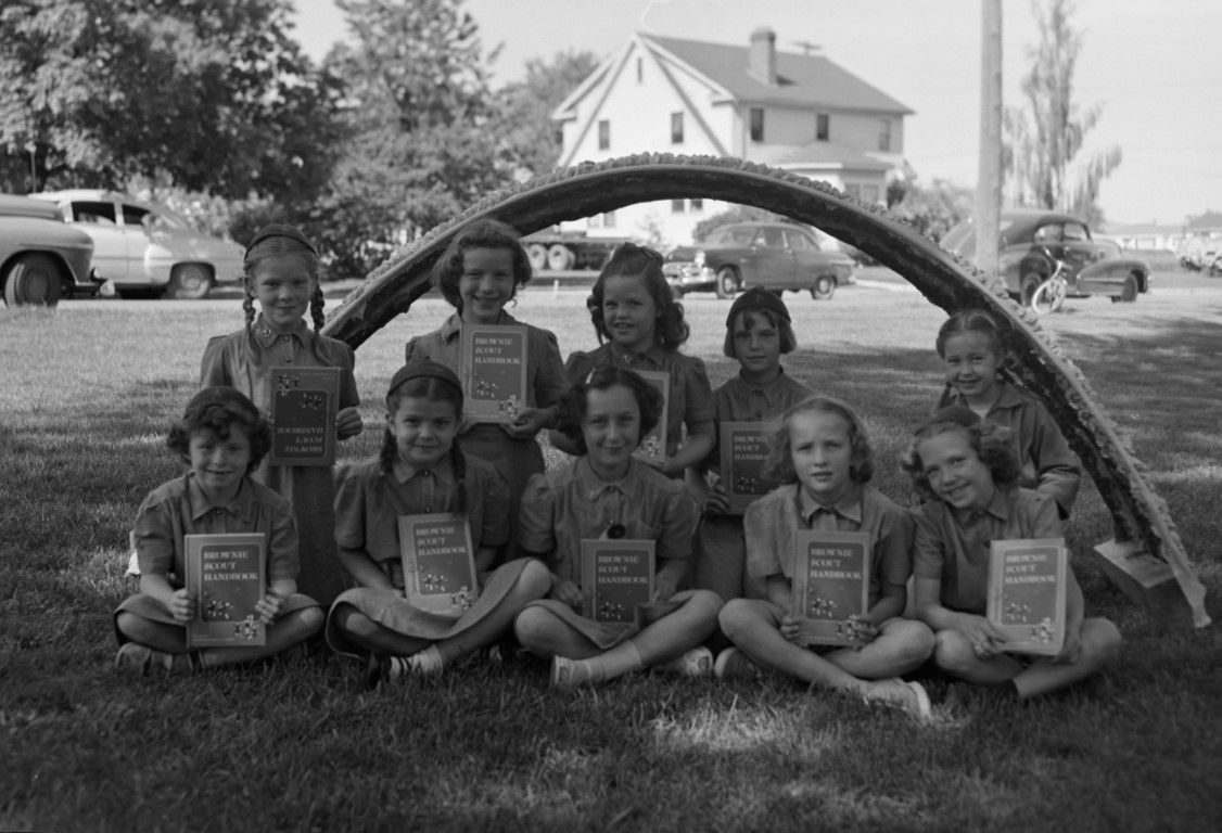 A group of ten girls in Brownie uniforms and holding copies of the "Brownie Scout Handbook" sitting in front of a rainbow arch in the northeast area of East City Park, 1st Street and Hayes Street intersection behind them.