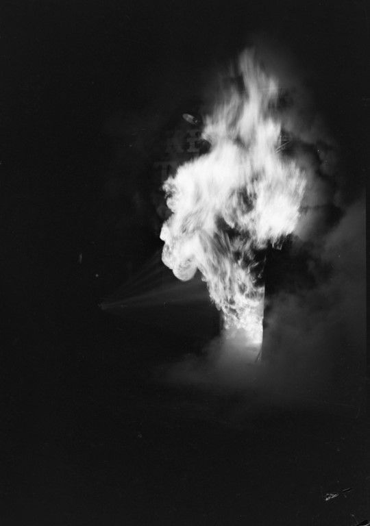 A structure fire at nighttime, a fire hose shoots water through an open doorway