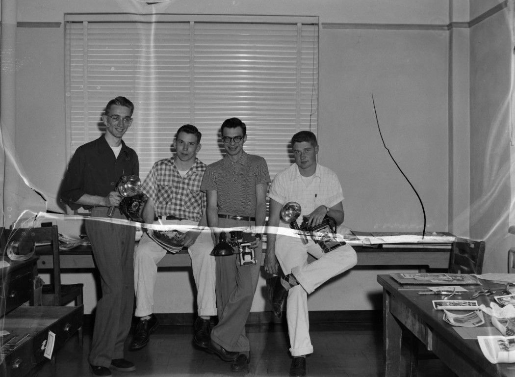 Young men with cameras posing for a picture in a work studio.
