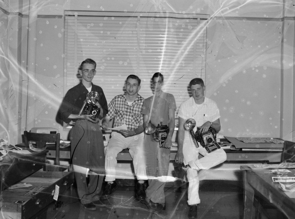 Young men with cameras posing for a picture in a work studio.