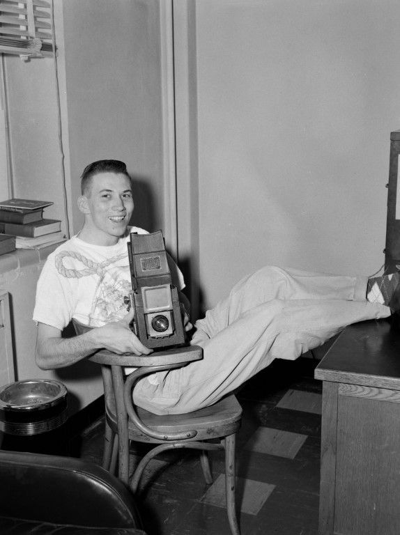A man sitting on a chair, wearing plaid socks, with his feet on a desk holding a camera. There is an ash tray and books behind the young man.