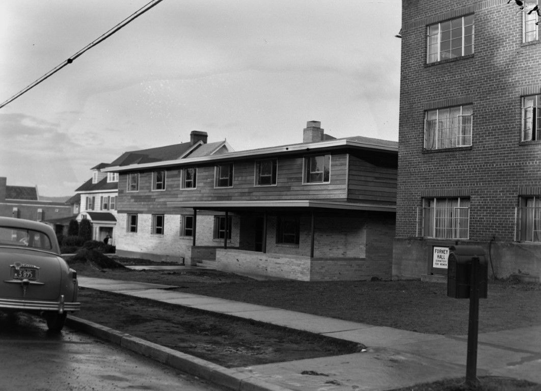 A car is parked in front of University of Idaho campus buildings. The Forney Hall Dormitory for Women is on the right.