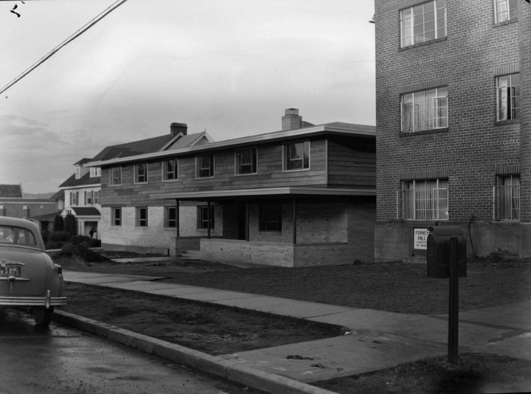 A car is parked in front of University of Idaho campus buildings. The Forney Hall Dormitory for Women is on the right. The lower building, centered, is the newly construct ed women co-operative dorm, Ethel Steele House.