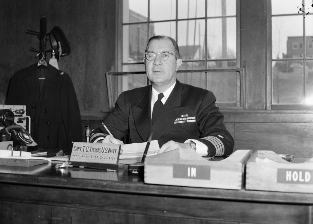Captain T. C. Thomas, U.S. Navy, in uniform and working at his desk.