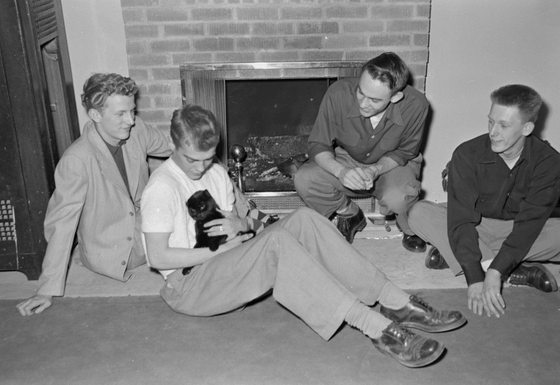 Four young men seated in front of a fireplace, one man holding a black cat