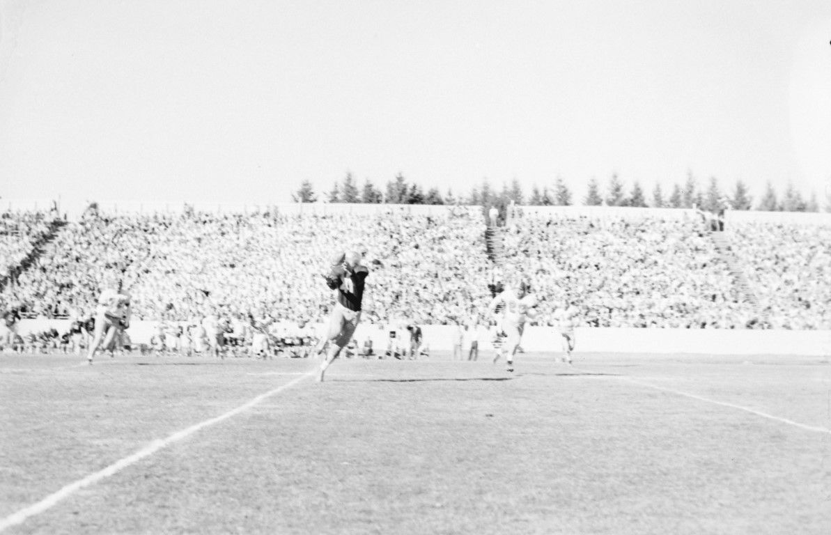 A football player is about to catch a forward pass in front of a crowd of spectators seated in the stands.