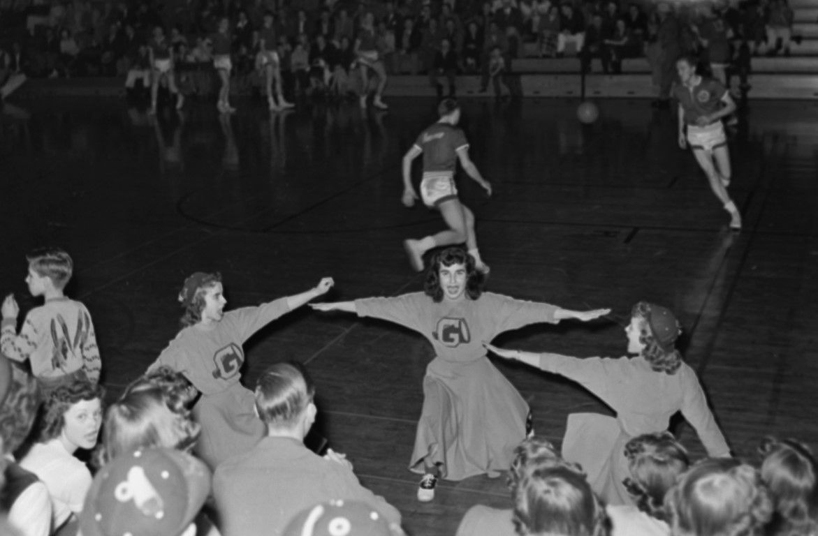 Crowd, team, and cheerleaders at a basketball game. The cheerleaders are wearing beanie hats and have a "G" on their sweaters.
