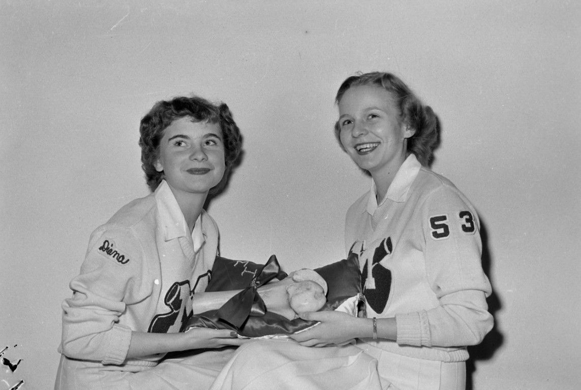 Two cheerleaders are holding a pillow with a large bone resting on it.
