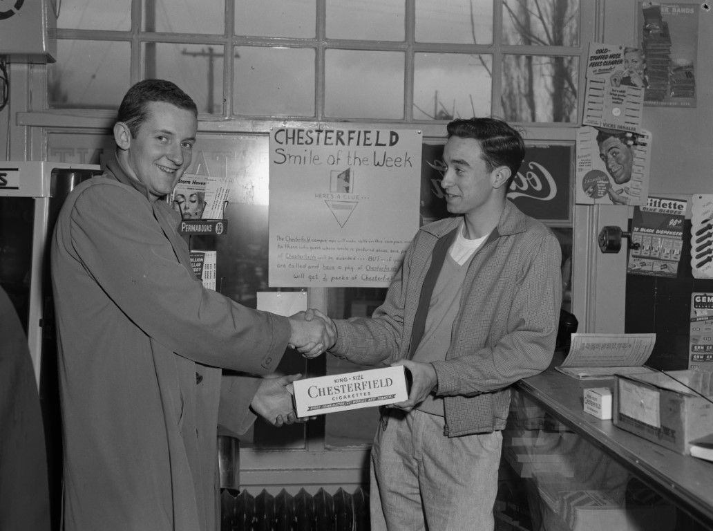 Two men shaking hands over a box of Chesterfield king-size cigarettes in a store.