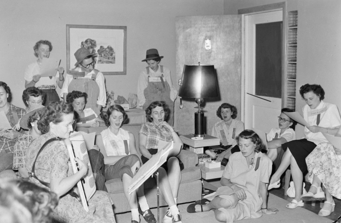A large group of women sitting in a living room, apparently practicing a play. Some are wearing costumes. A woman plays the accordian on the left. (Group of photos: 1234, 1236, 1238, 1239, 1240, 1241)