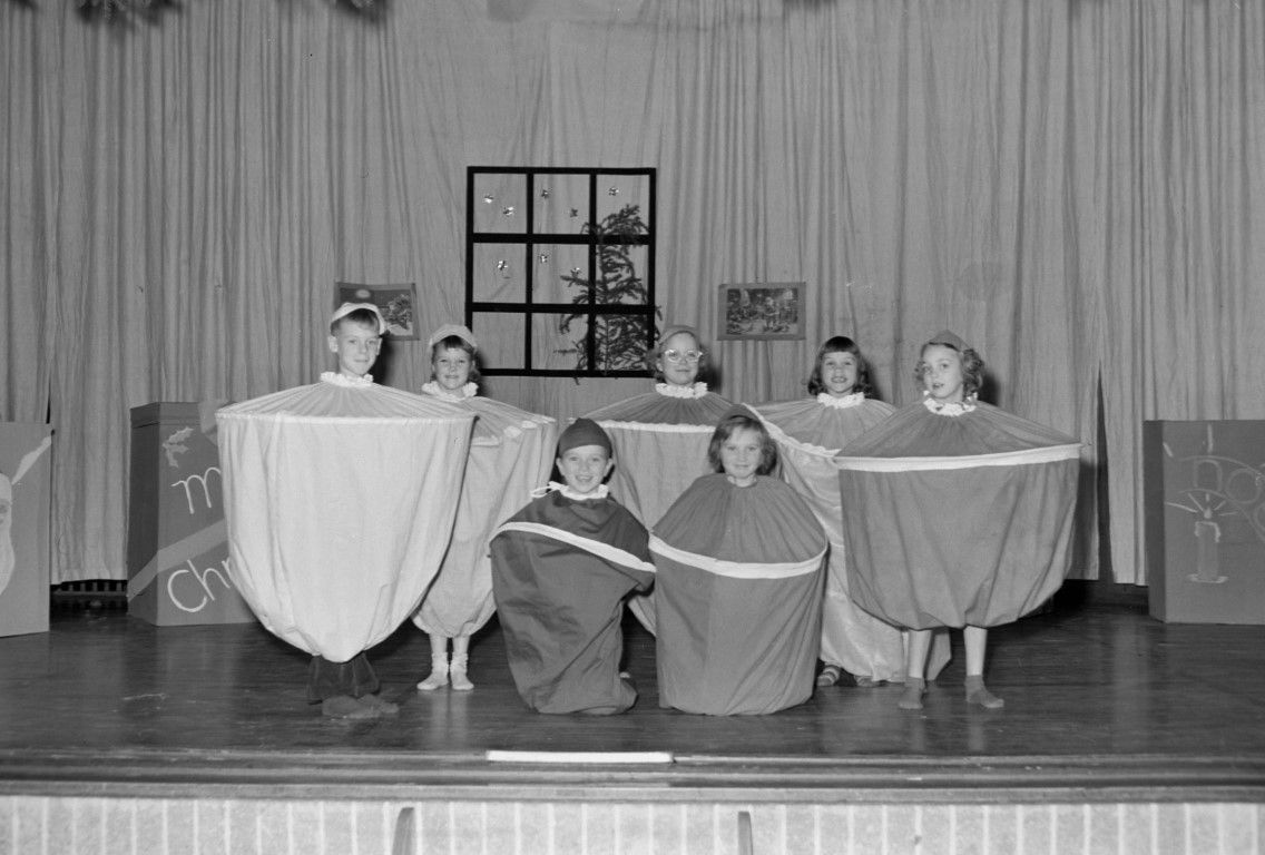 A group of children dressed in matching costumes on a stage decorated for Christmas