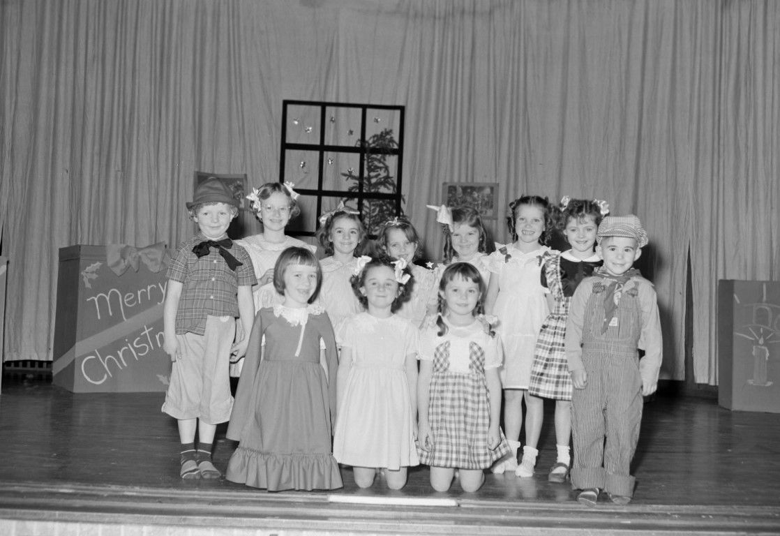 A group of children dressed in costumes on a stage decorated for Christmas