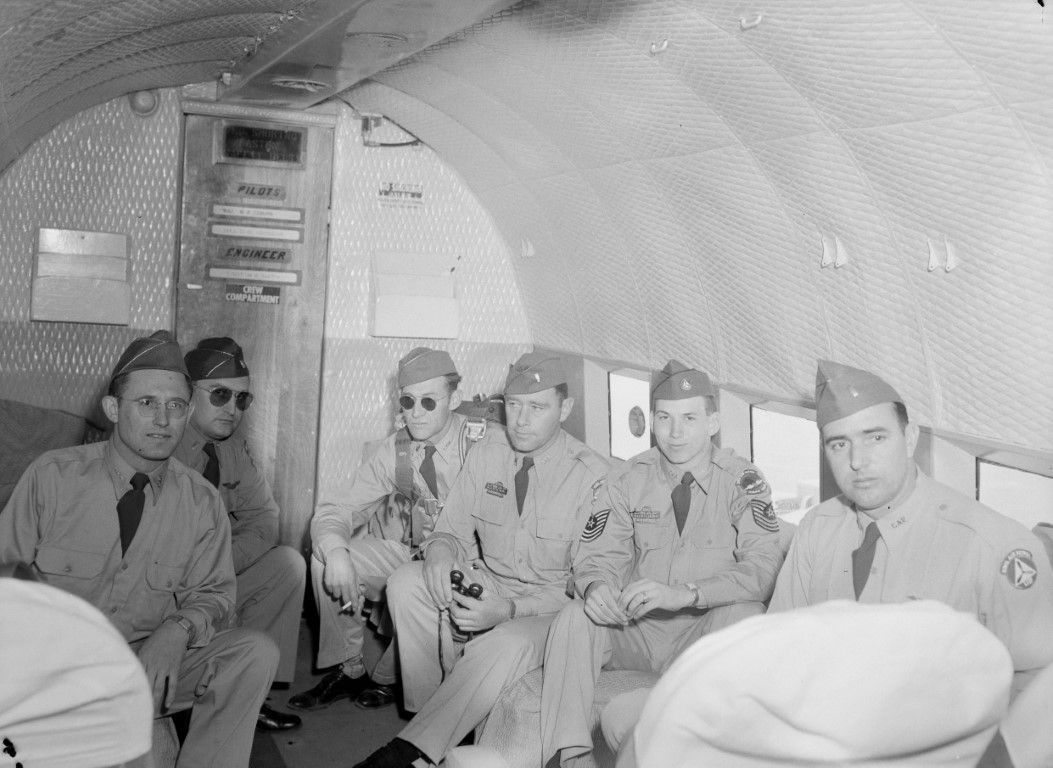Men of the Civil Air Patrol in uniform are sitting inside an airplane on a flight to Boise. One of the men is holding a cigarette and another has binoculars in his hand.