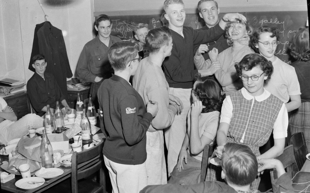 A group of young people having a party in a classroom.