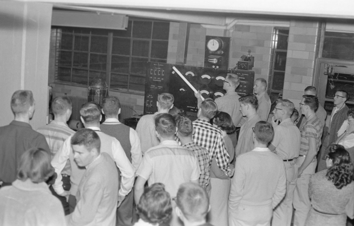 A group of people is watching as a man is standing and pointing at something in front of an electronic control panel.