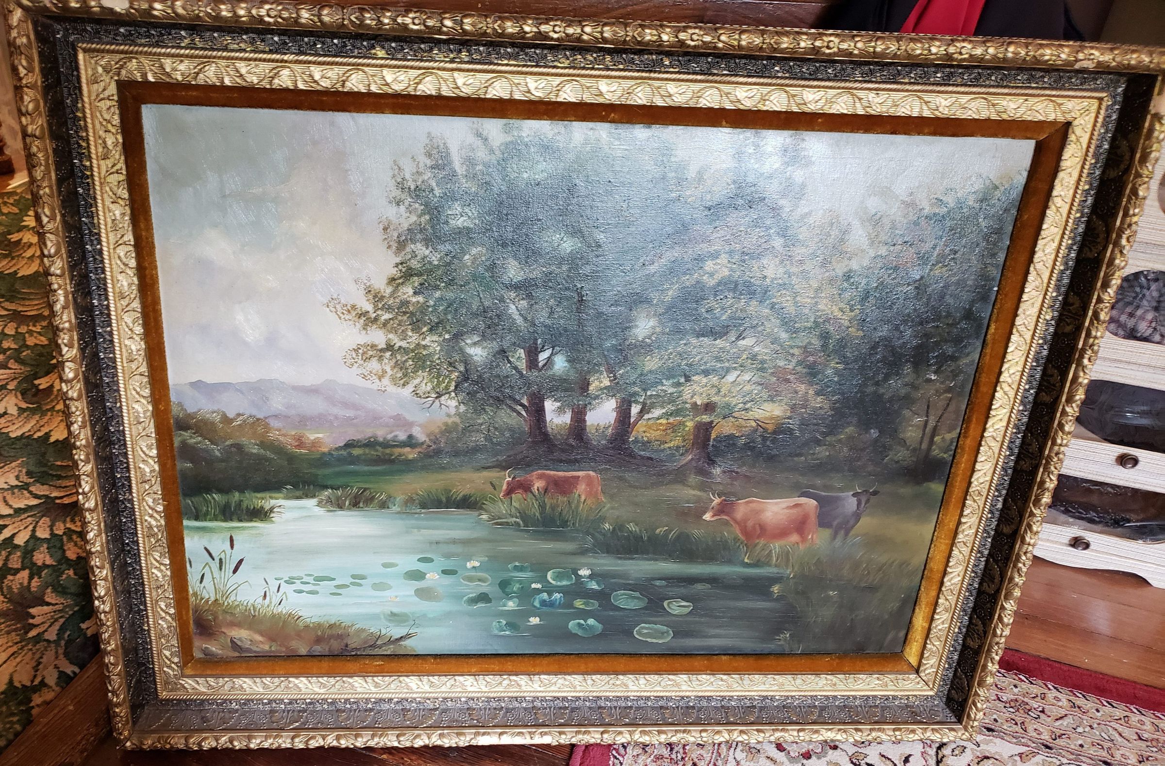 oil painting; scene of 3 cows, pond, and background of trees by Minnie Taylor Lauder.