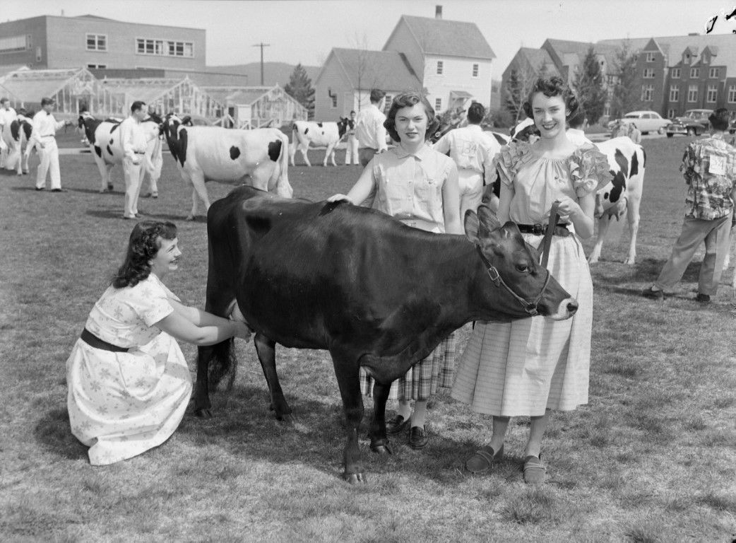 Three young women wearing dresses standing with a cow with several other cows and their handlers in the background.