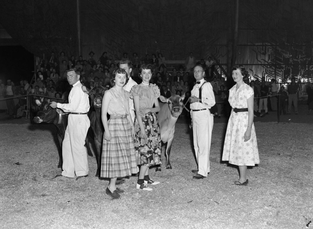 Three men posing with their cows and three women in the exhibition hall at an agricultural fair.