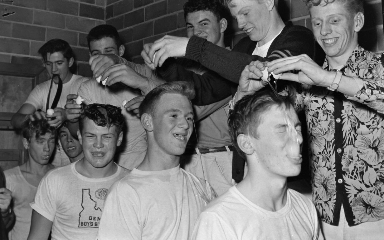 A group of boys are cracking eggs onto the heads of a line of some other boys as an initiation into the "M" Club.