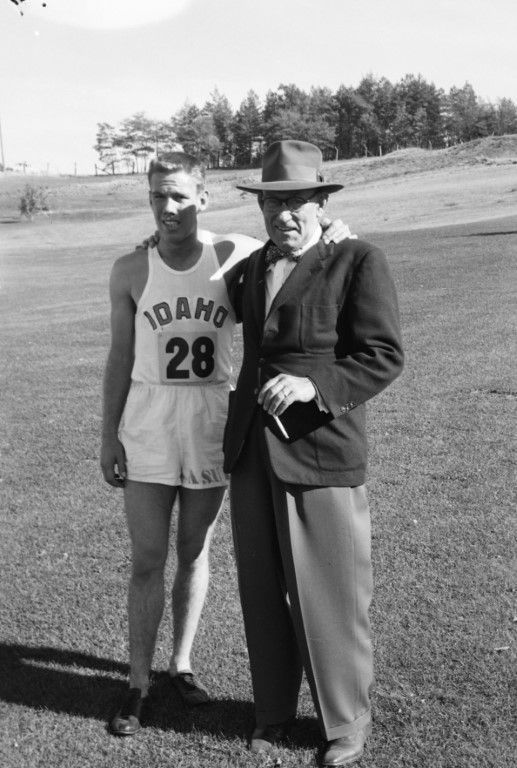 A runner is posing in a field with a man wearing a suit and a hat. Cross country competitor U of I golf course