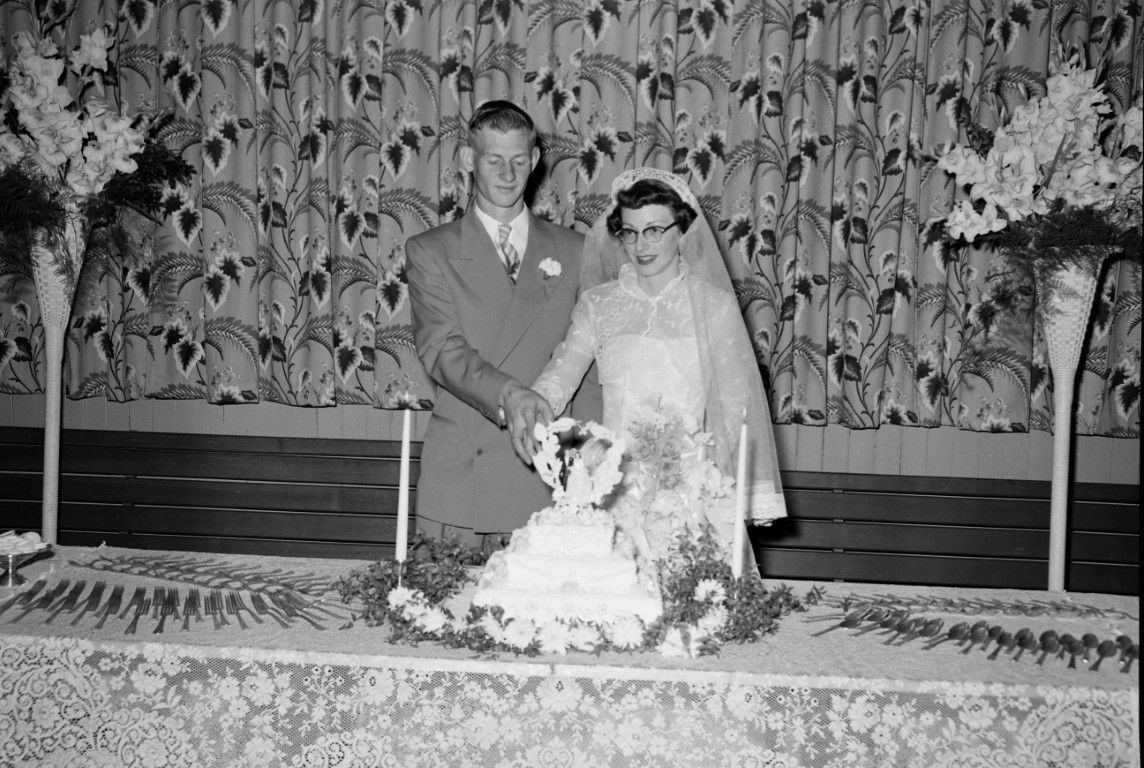 Rick Jones wedding: The bride and groom are at the table standing between two tall flower stands and cutting the wedding cake.
