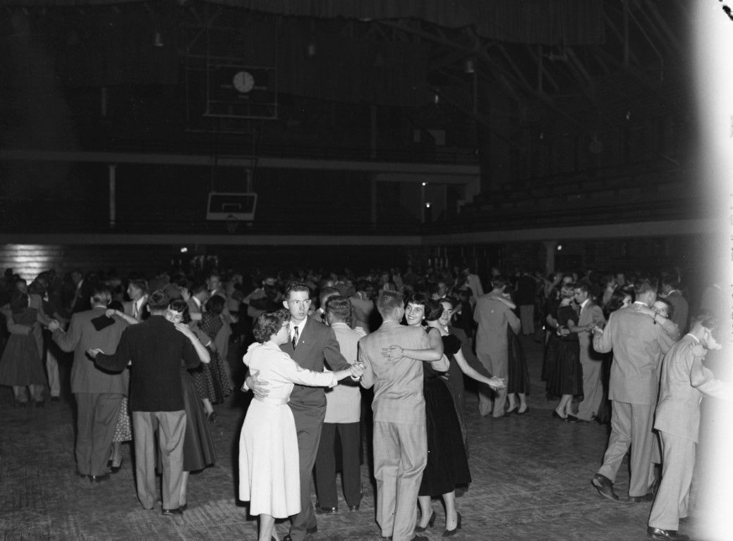 A very large group of couples is dancing in a gymnasium.