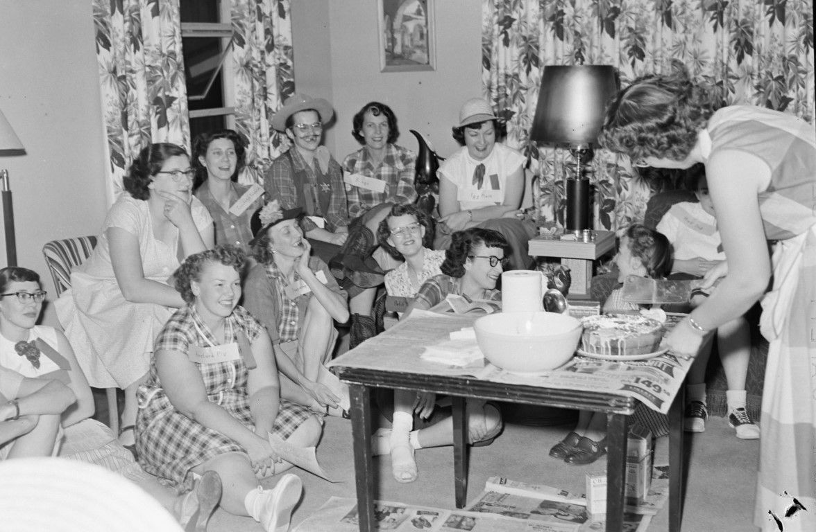 A large group of woman sitting in a living room, apparently practicing a play. A woman cuts a cake cake with a meat cleaver at a table.