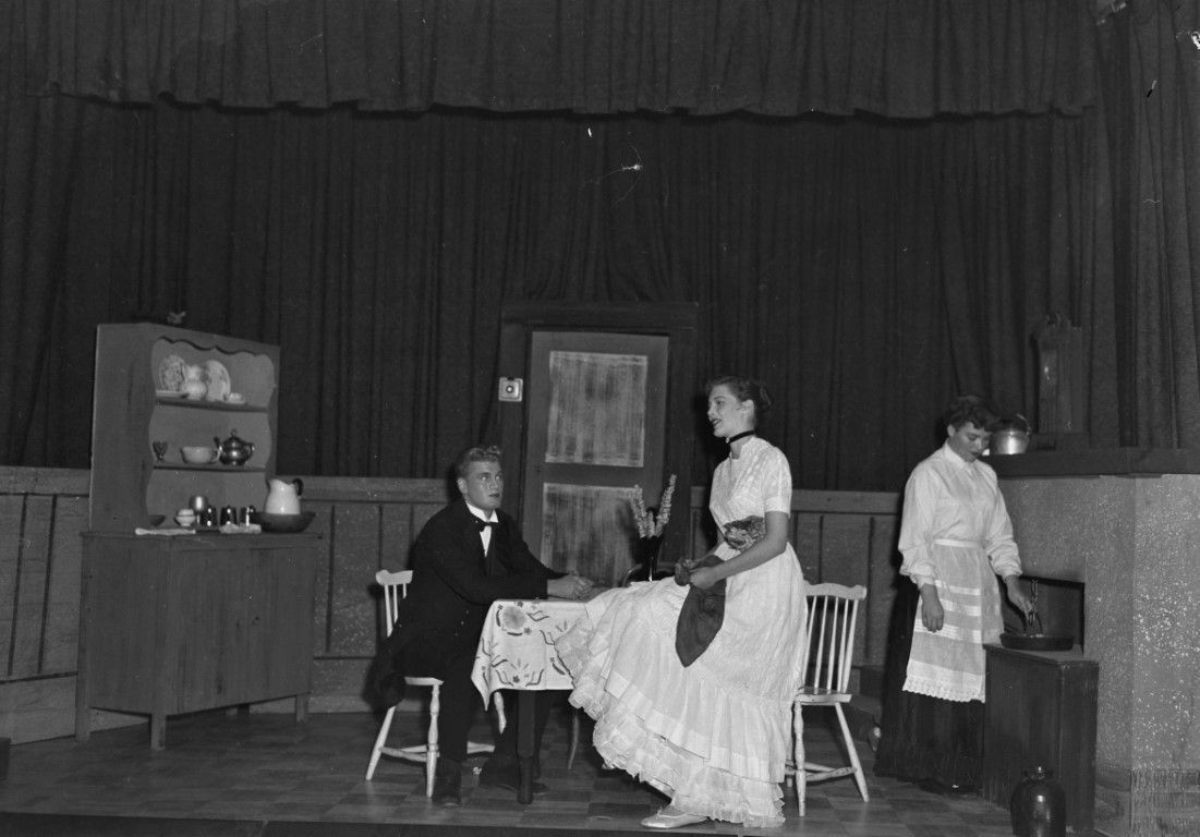 Three actors are performing a dining room scene on stage.
