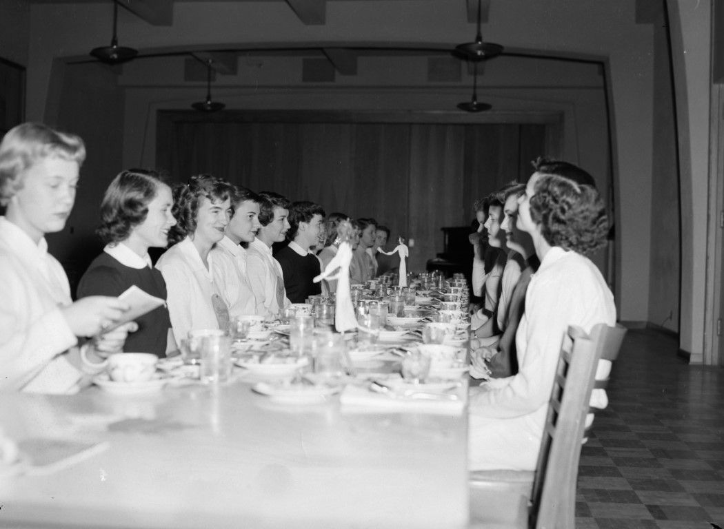 A group of young women sitting at a long table waiting for a meal in an auditorium.