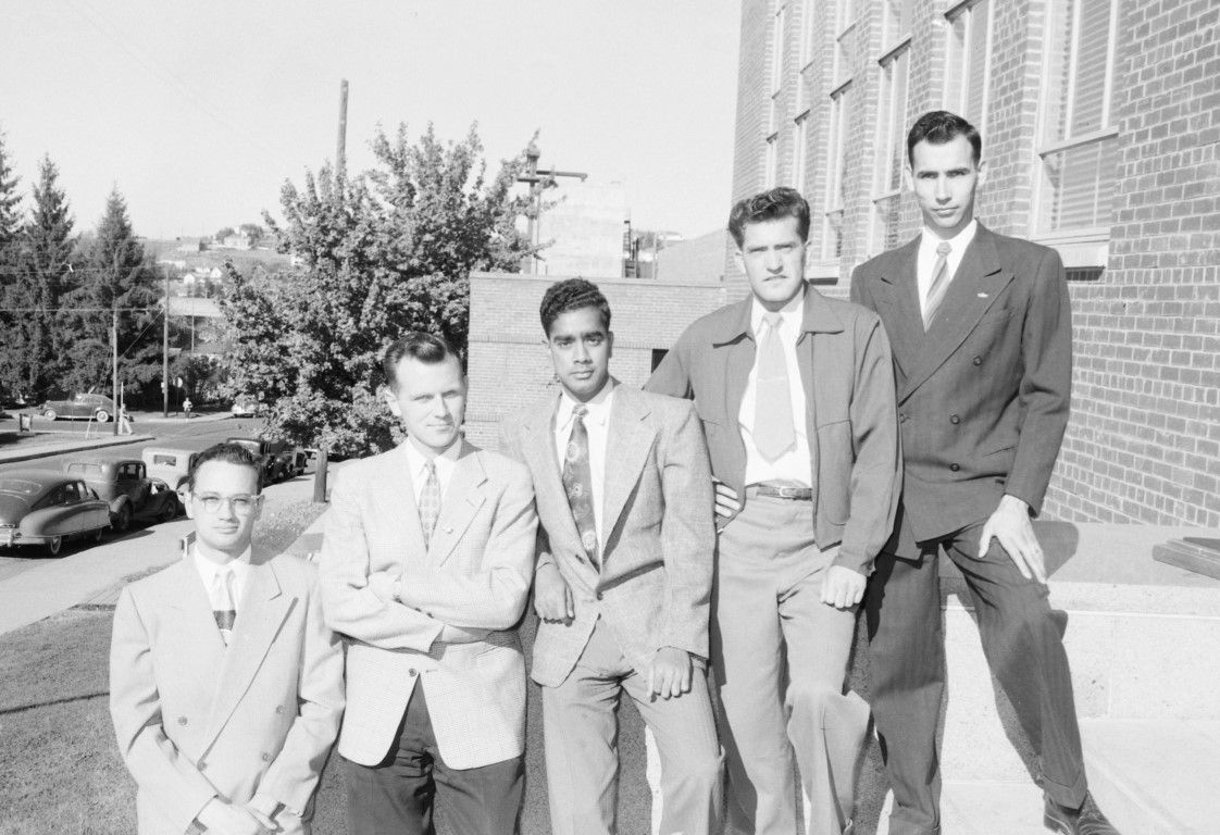 Five well-dressed distinguished looking men are posing for a picture outside of the entryway to a brick building. Cars are parked on the street in the background.
