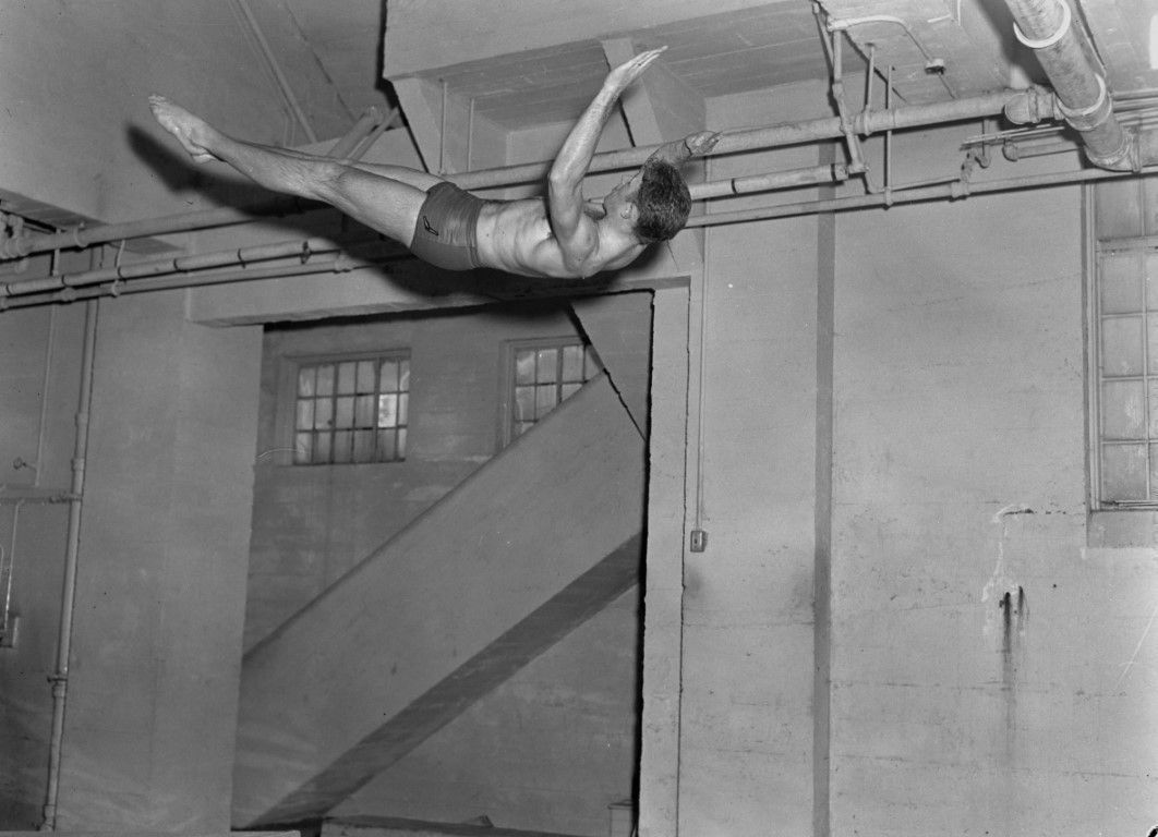 A man horizontally in the air after jumping off a diving board.