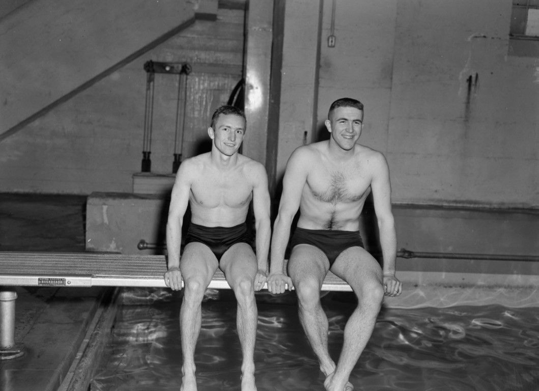 Two University of Idaho swim team members sitting on a diving board above a pool.