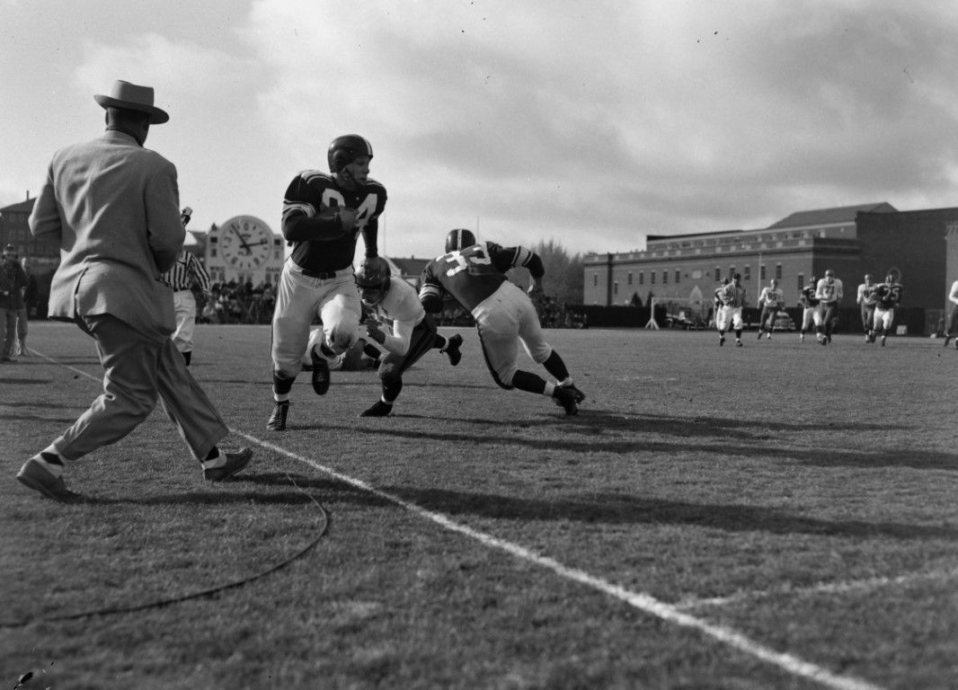 A football player is running down the sideline with the ball as a member of the opposing team attempts to make the tackle. Other players are seen running toward the play and a man in street clothes and a hat is stepping towards the sideline. the large play clock can be seen in the background.
