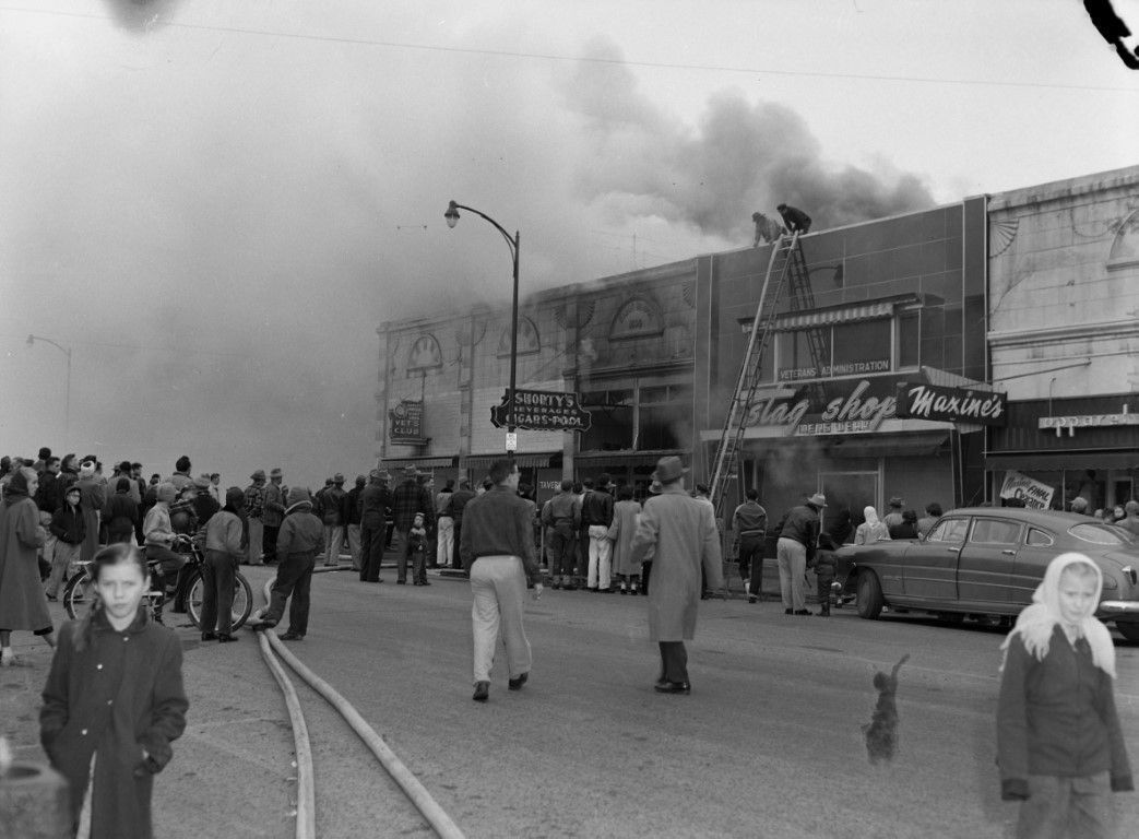 A crowd gathers on Main Street in front of the Vet's Club, Shorty's, Maxine's Stag Shop, and the Veterans Administration as firemen work to extinguish a fire in the buildings.