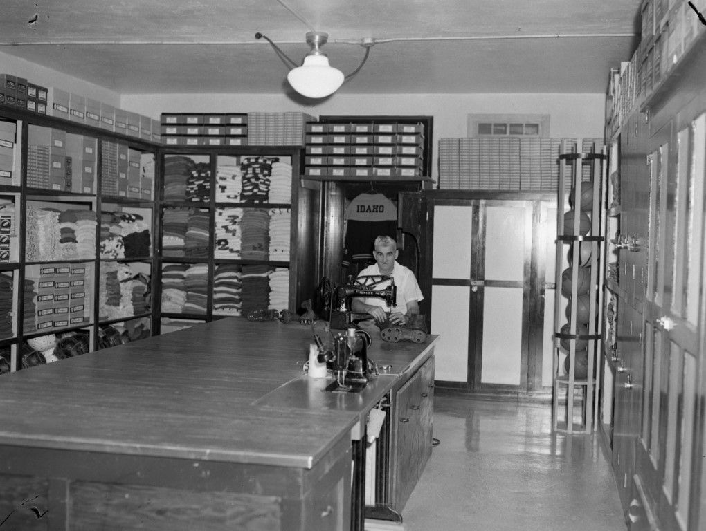 A man is repairing a shoe with a sewing machine in the University of Idaho equipment room.