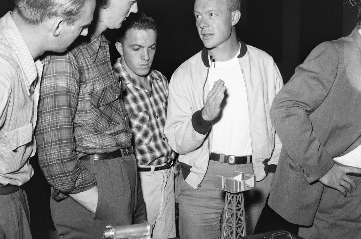 A young man is explaining the items on a display table to a group of other men.