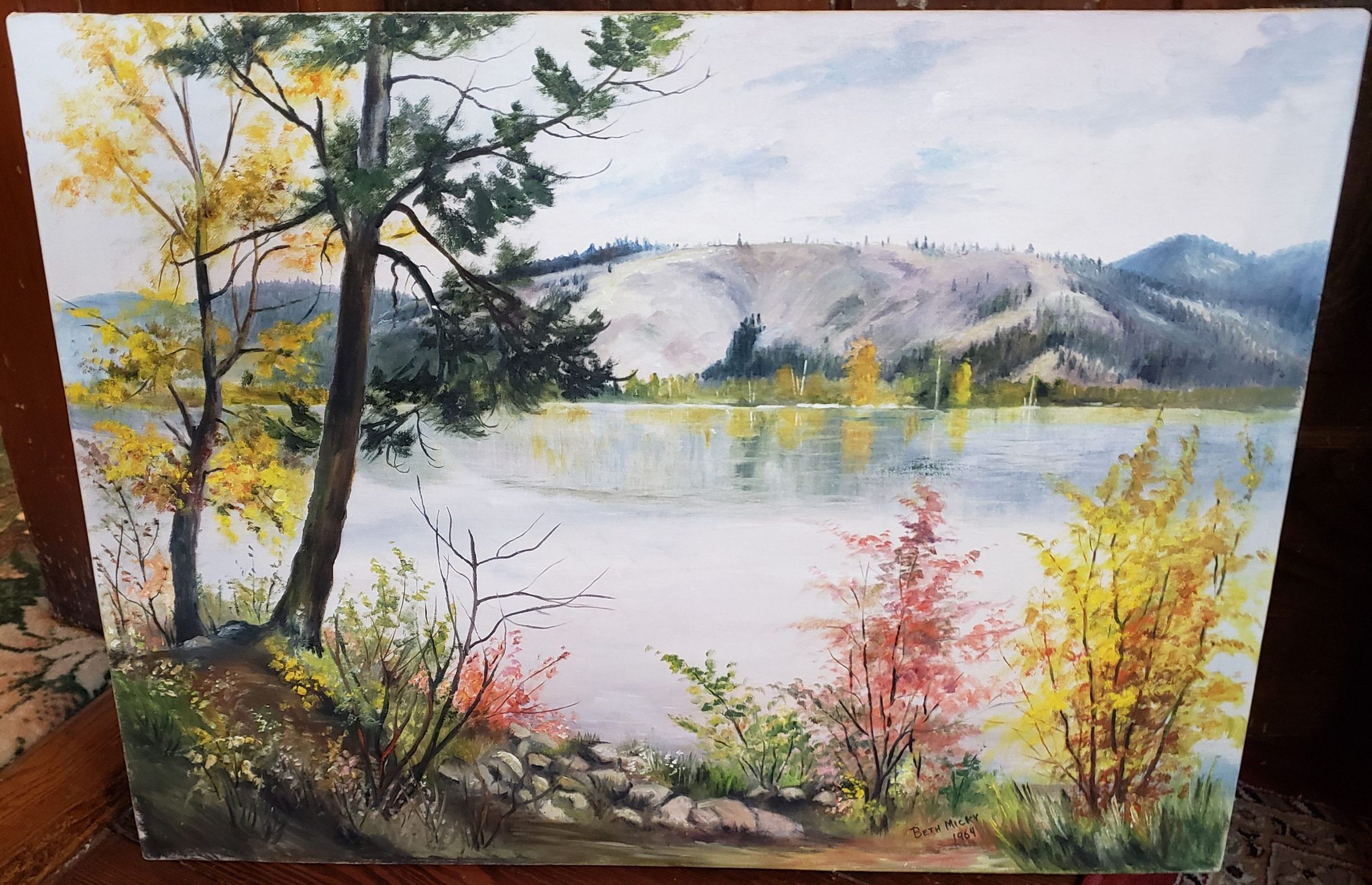 Painting by Beth Mickey - Fall on Chatcolet Lake, 1964. Given to Pauline Sherman as a wedding gift. Painted while sitting in her lake cabin.