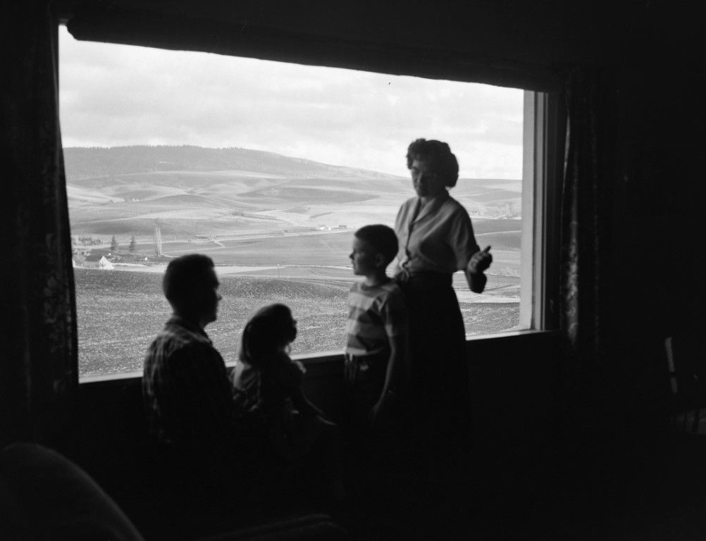 Family portrait - a little girl and boy, a woman and man, posed in front of a large window, rolling hills (possibly Paradise Ridge) visible in the distance (similar to 1335, 1336)