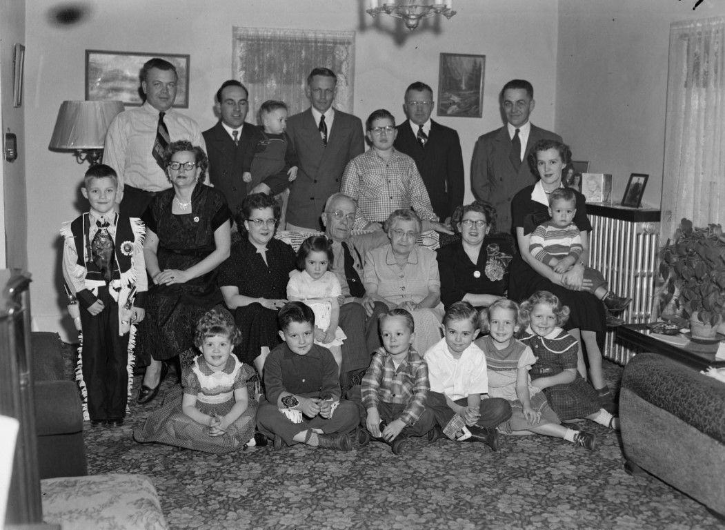 A multi-generational group photo of a family inside a home.