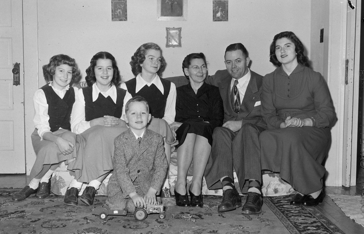 A family sitting on a couch and a boy on the carpet with a toy tractor.
