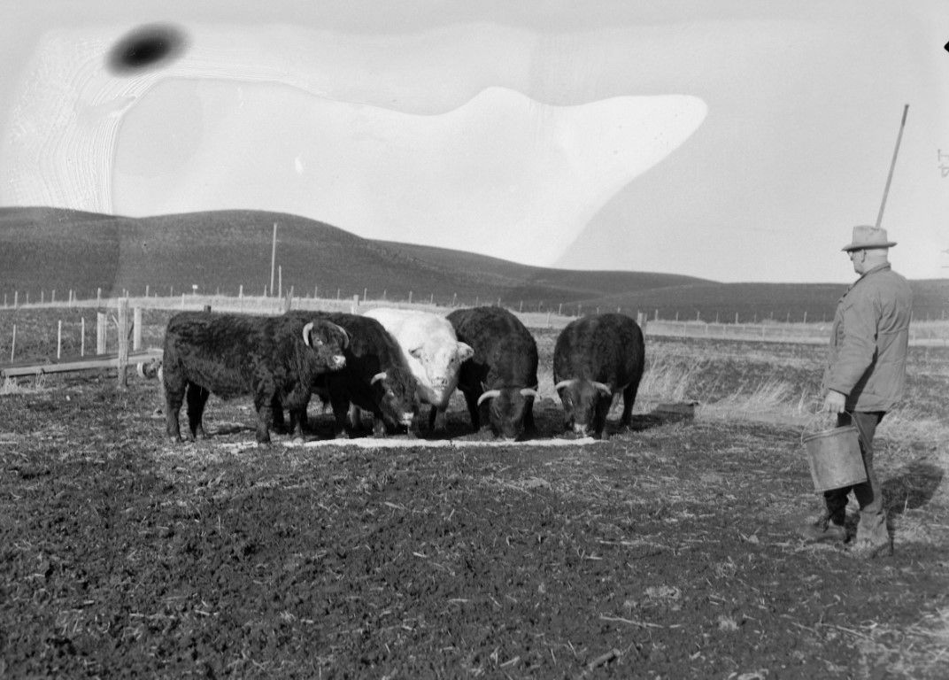 A farmer carrying a bucket is standing in the paddock with a few of his cattle.