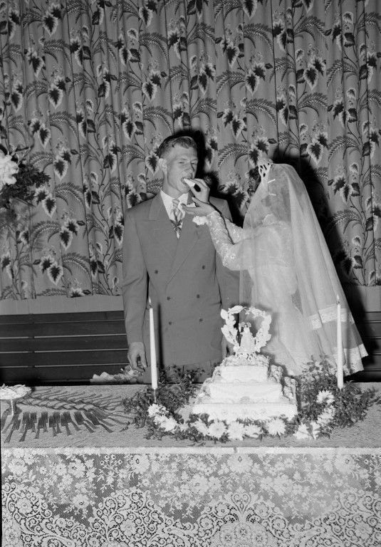 Rick Jones wedding: The bride is feeding wedding cake to the groom. The cake is placed on the table between two burning candles.